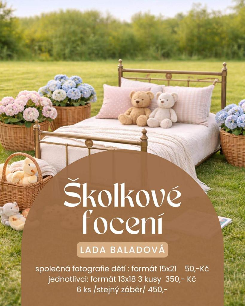 Na školní zahradě se 14. 4. uskuteční jarní fotografování s Ladou. Každý zájemce si může objednat fotografie ve formátu 13x18 cm, a to buď 3 kusy za 350 Kč, nebo 6 kusů ze stejného záběru za 450 Kč. Přijďte si užít krásné chvíle a zachytit jarní atmosféru.